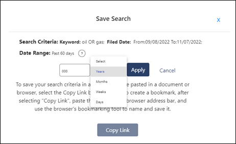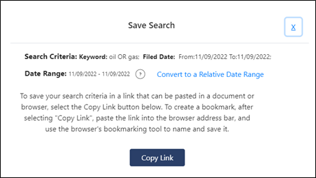 1. Click the Save Search link at the top of the screen. You can save your search Criteria using a Fixed date range or a Relative Date range. If your original date ranch for your search was fixed, then the Convert to a Relative Date Range link will display.